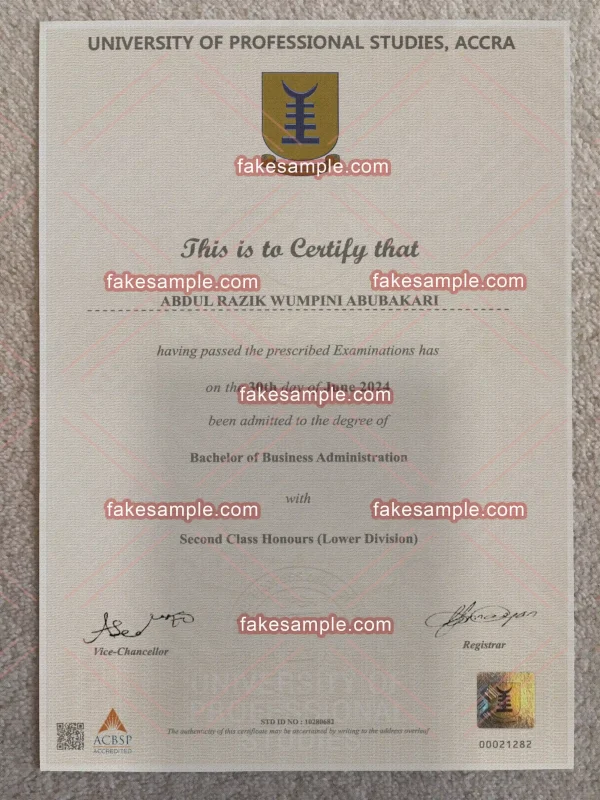 The fake Accra (UPSA) Degree Certificate Fake Template is 100% similar to the original and is presented in full HD quality.