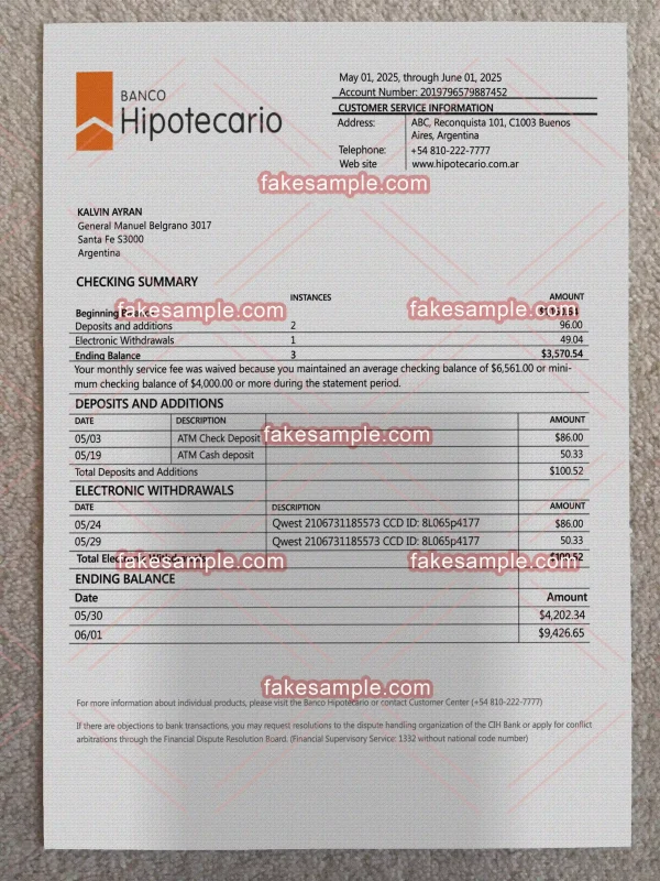 Apart from Argentina Bank Statement , you can also buy other documents related to Argentina from Fakesample store: these documents include Argentina fake identity card , Argentina fake passport , Argentina fake driver's license , Argentina fake diploma , fake university certificate , Argentina fake invoice , Argentina fake utility bill , Argentina fake proof address , Argentina fake bank statement , Argentina fake Company Certificate , Argentina fake Business Licences , etc.