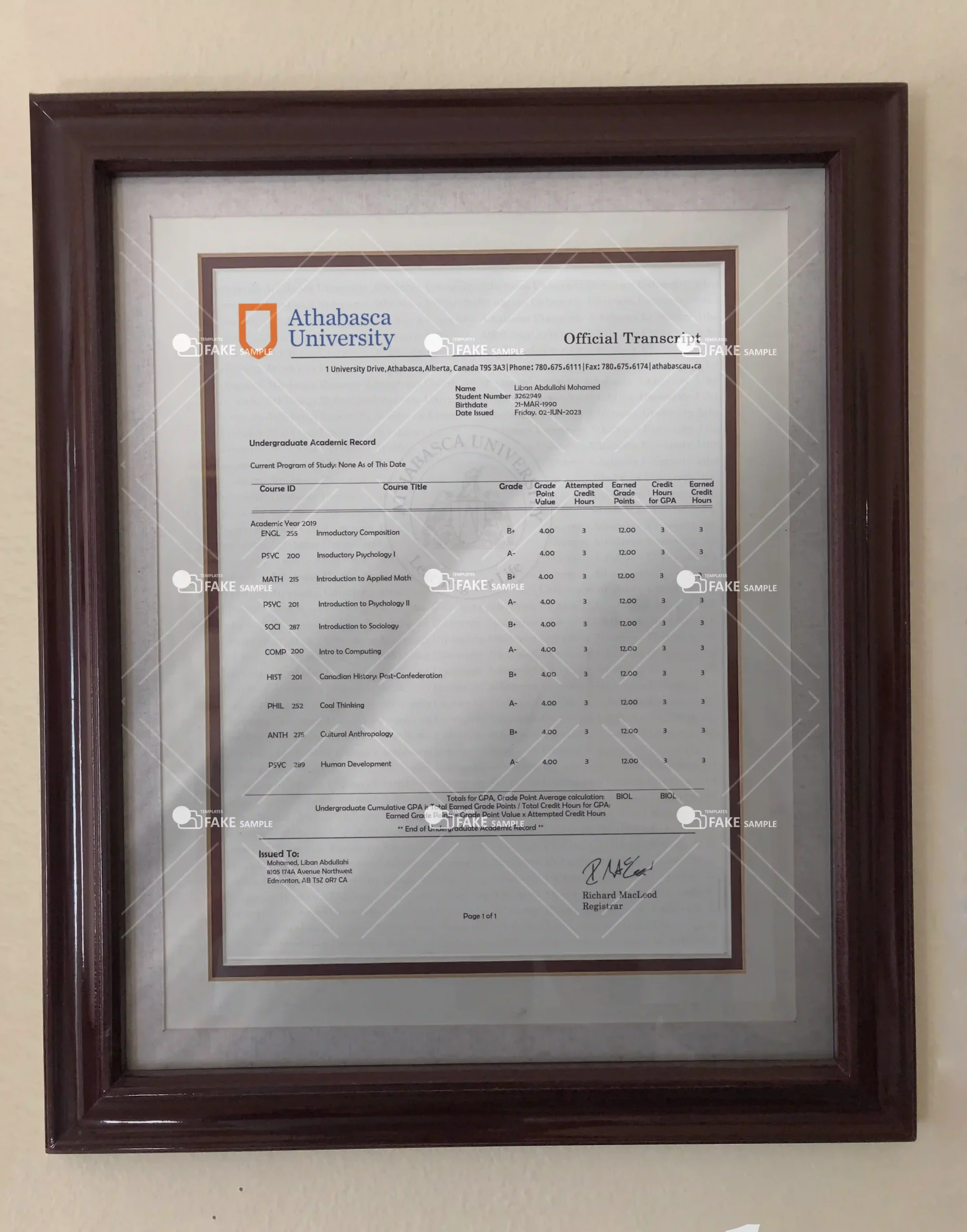 The fake Athabasca University transcripts Template is 100% similar to the original and is presented in full HD quality.