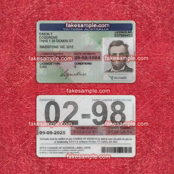 To accompany the digital expertise, Fakesample offers the making of physical Victoria, Australia Driver's License cards. Adhering to exact specifications commonly found in genuine cards, Fakesample ensures that the replicas pass a superficial authenticity test. By employing advanced printing techniques and top-grade materials, these physical cards embody both durability and credibility, closely resembling their authentic counterparts in appearance and feel.