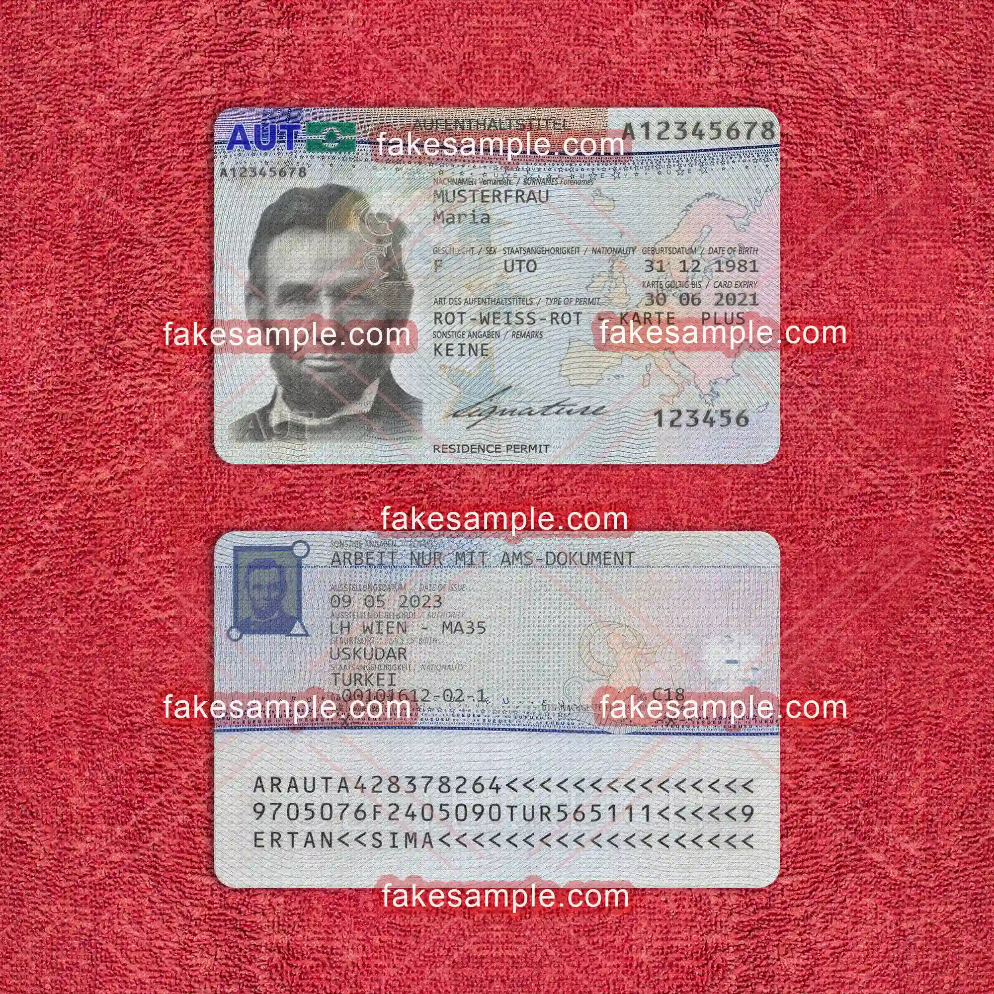 Fakesample's reputation is built on quality, speed, and versatility, allowing us to serve clients worldwide with exemplary products. By choosing Fakesample, you engage with a service committed to delivering high-quality document templates that meet your needs quickly and efficiently. Whether you're in the market for a fake Austria Residence Card or any other document template, our products offer the realism and practicality required in our digital age.