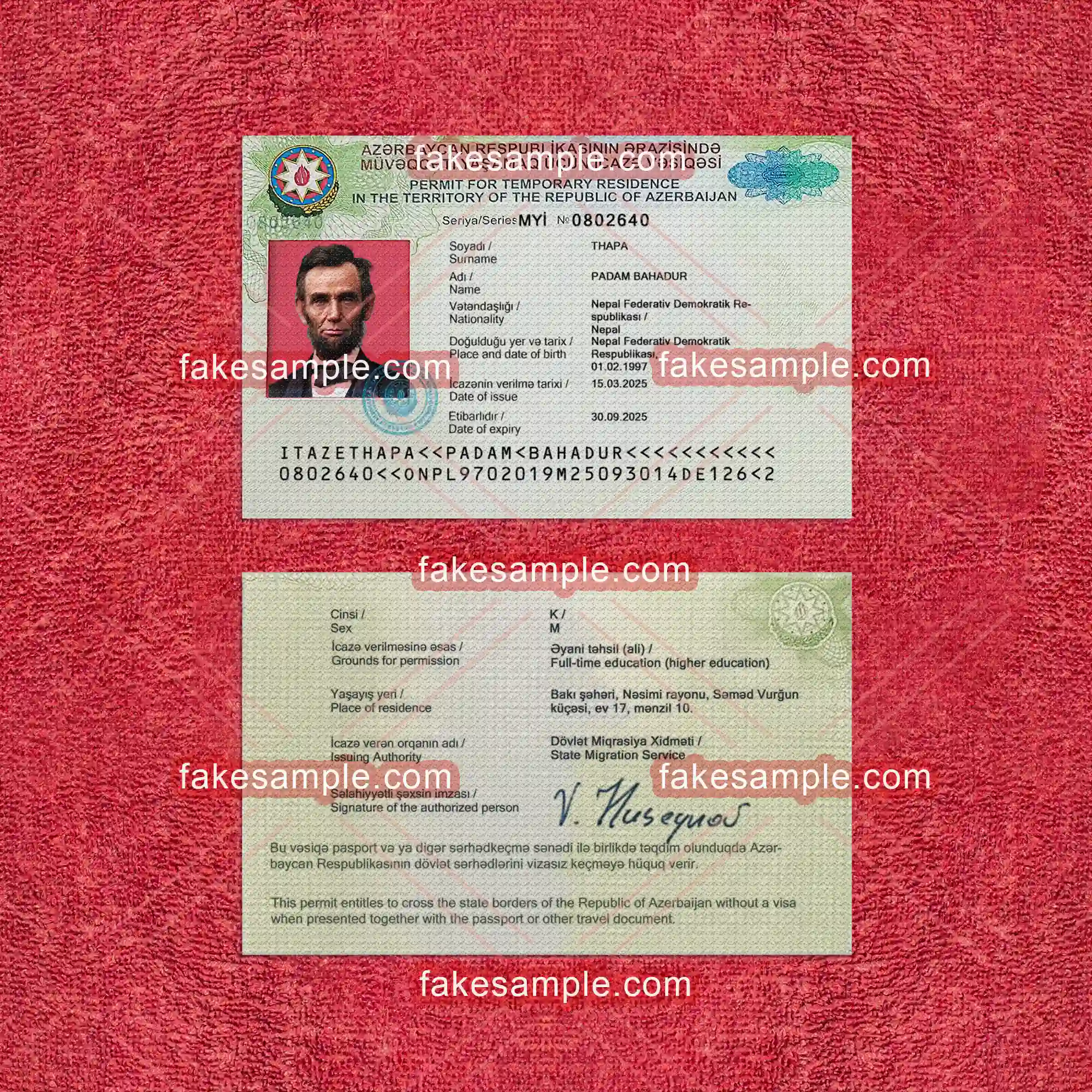 Fakesample's reputation is built on quality, speed, and versatility, allowing us to serve clients worldwide with exemplary products. By choosing Fakesample, you engage with a service committed to delivering high-quality document templates that meet your needs quickly and efficiently. Whether you're in the market for a fake Azerbaijan Residence Card or any other document template, our products offer the realism and practicality required in our digital age.