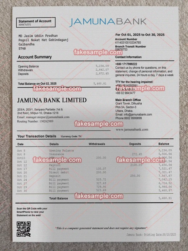 At Fakesample, we understand that authenticity in appearance and quality can make all the difference when a document is used for various non-official purposes. Our Bangladesh Bank Statement Fake Templates are meticulously crafted by our skilled graphic team to ensure they look as authentic as possible. These templates are perfect for users who require realistic-looking financial documents within a short timeframe. With a focus on design precision, our templates replicate the tiniest details found in genuine bank statements.