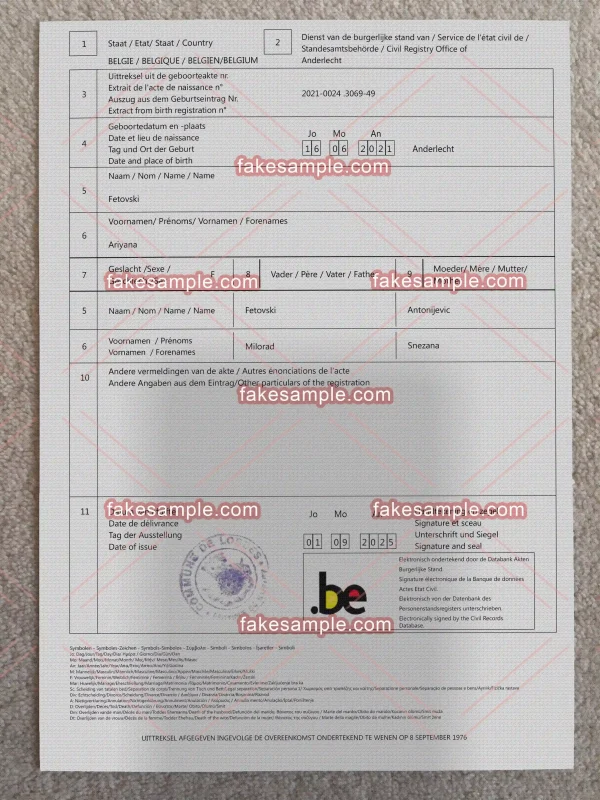 The fake Belgium Birth Certificate Fake Template is 100% similar to the original and is presented in full HD quality.