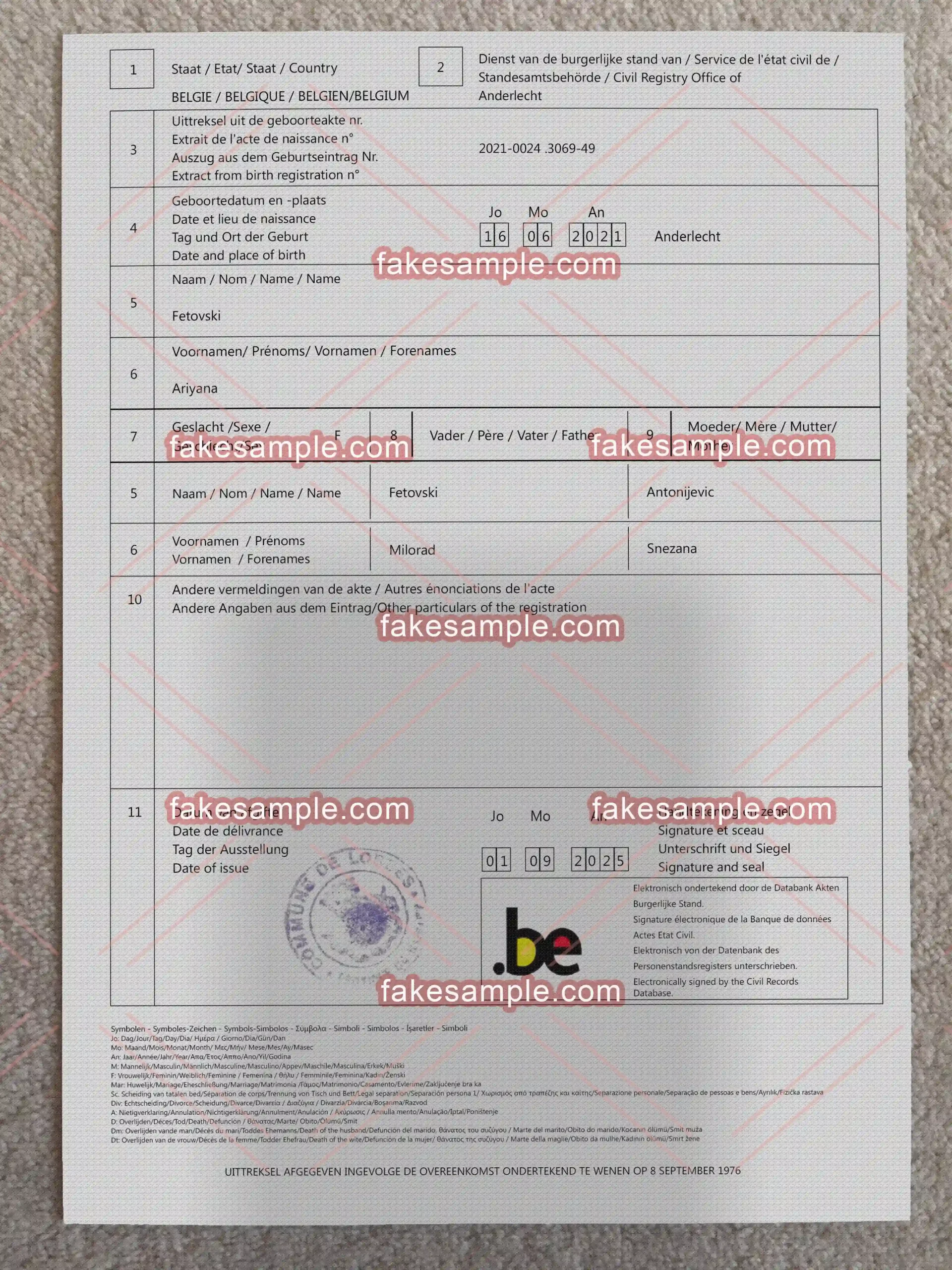 In order to buy a fake Birth Certificate of Belgium , you can buy its editable psd file and download it immediately from FakeSample online store. After buying the Belgium Birth Certificate fake template , you can edit and use it with Afrar Photoshop software.