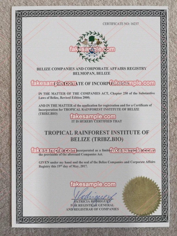 The fake Belize Company registration certificate Fake Template is 100% similar to the original and is presented in full HD quality.