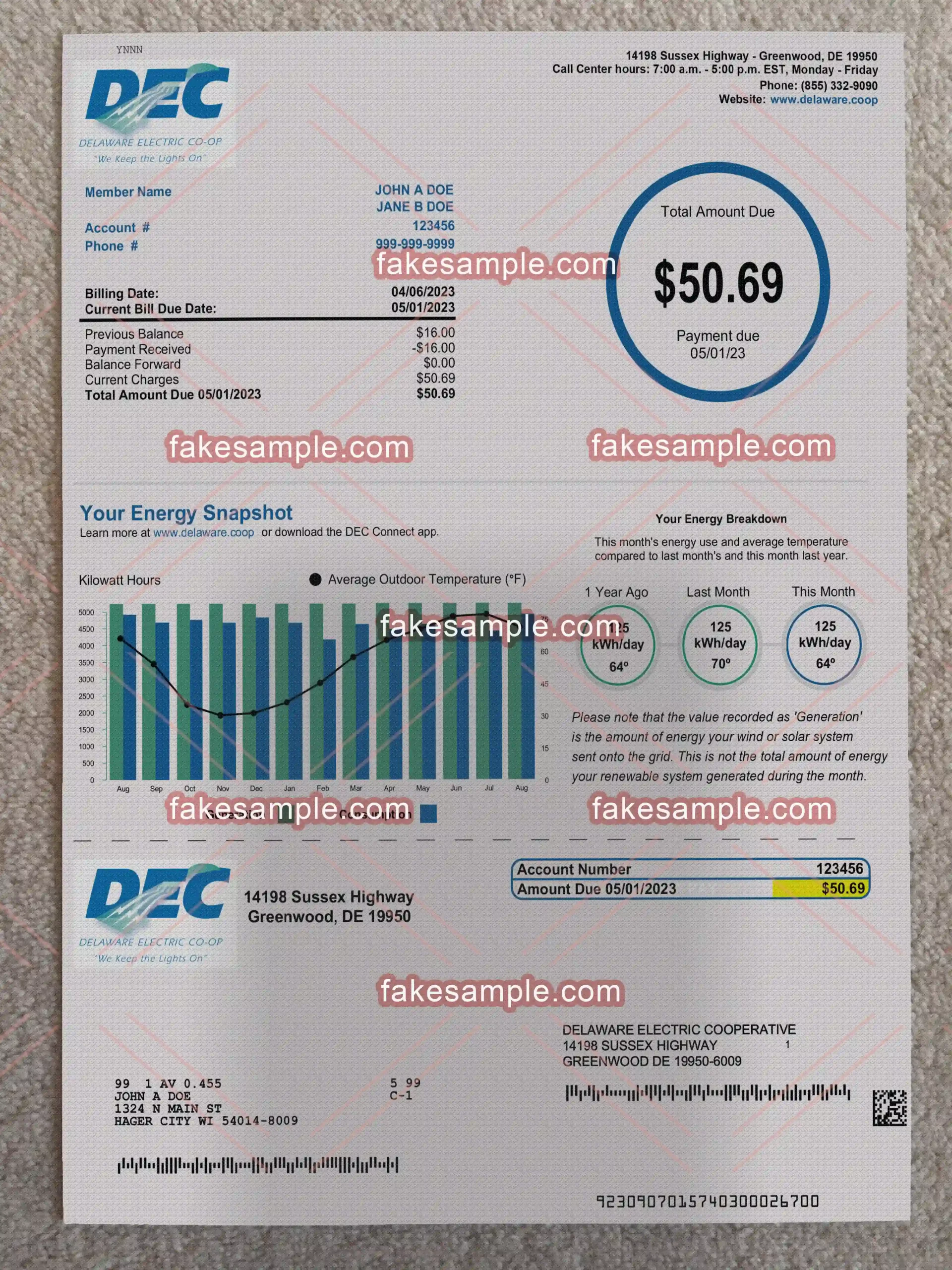 The fake Delaware Utility Bill Fake Template is 100% similar to the original and is presented in full HD quality.