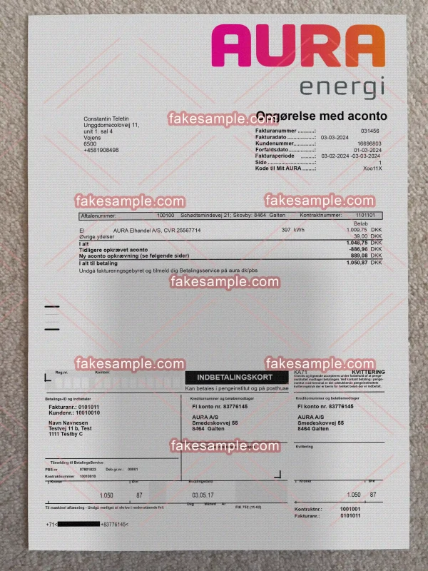 In a world where identity and verification are key, Fakesample stands as a prominent player, offering a spectrum of services ranging from identity card customization to the intricate design of fake utility bills. Whether you are looking for a convincing Denmark utility bill fake template or high-quality document replicas, Fakesample provides professional services that align with your needs—even if that means creating a document for verification purposes. Operating from its digital headquarters at https://fakesample.com, Fakesample ensures that its offerings cater to a global audience.
