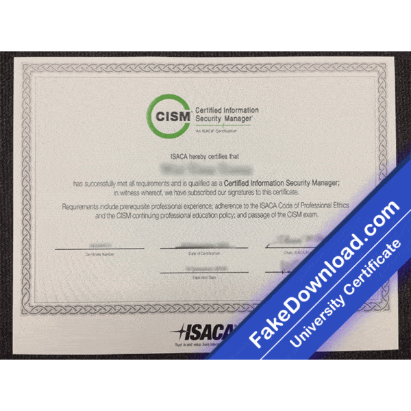 The fake Information Security Manager (CISM) university certificate is 100% similar to the original and is presented in full HD quality.