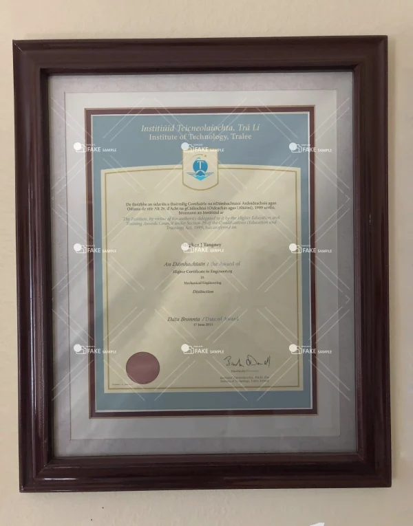 The fake Institute of Technology Tralee (IT Tralee) university certificate is 100% similar to the original and is presented in full HD quality.