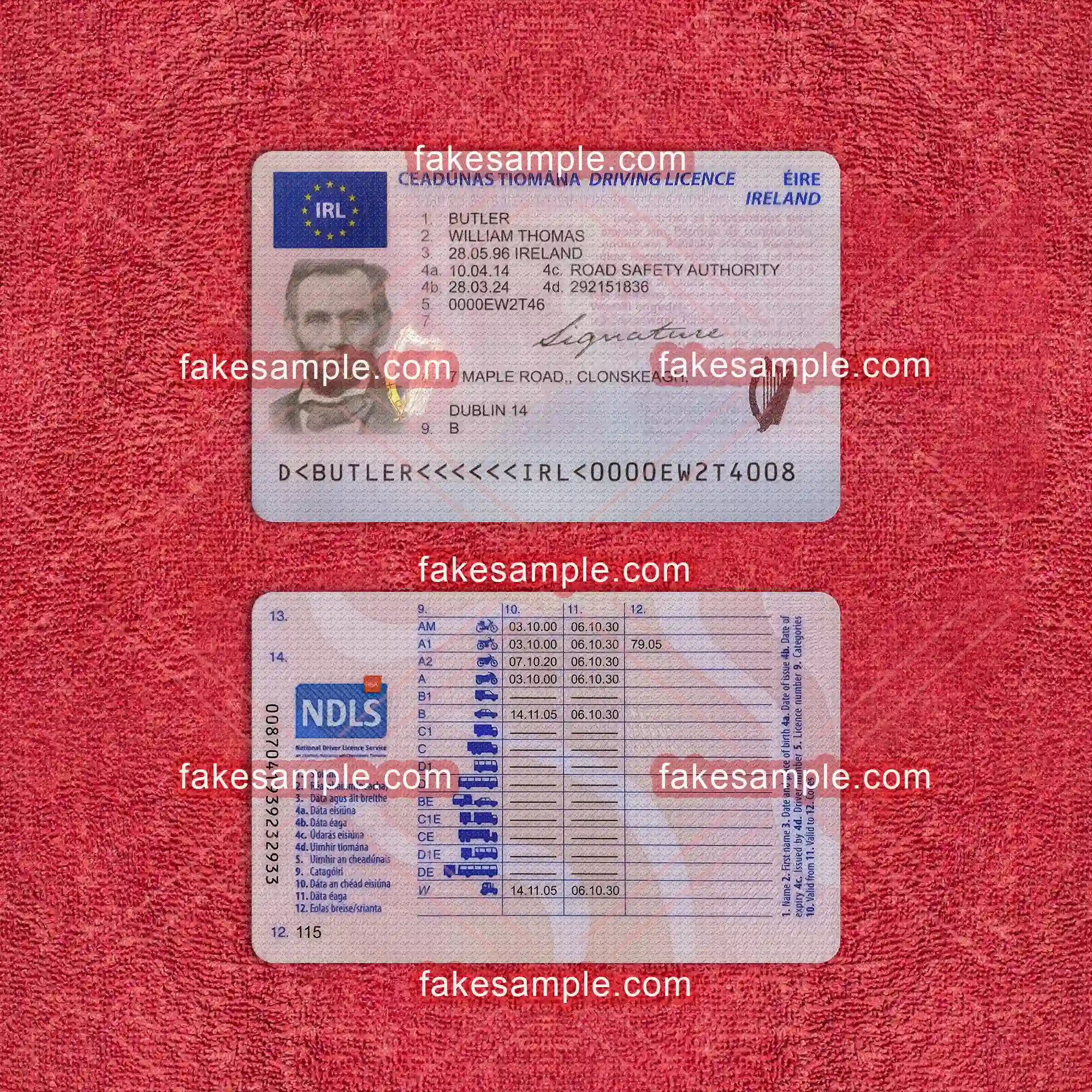 To accompany the digital expertise, Fakesample offers the making of physical Ireland Driver's License cards. Adhering to exact specifications commonly found in genuine cards, Fakesample ensures that the replicas pass a superficial authenticity test. By employing advanced printing techniques and top-grade materials, these physical cards embody both durability and credibility, closely resembling their authentic counterparts in appearance and feel.