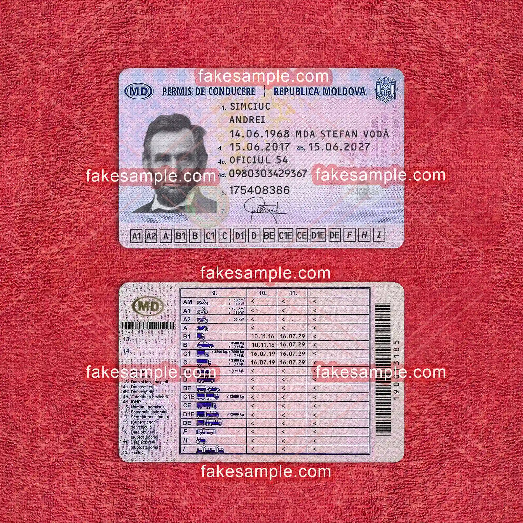 To accompany the digital expertise, Fakesample offers the making of physical Moldova Driver's License cards. Adhering to exact specifications commonly found in genuine cards, Fakesample ensures that the replicas pass a superficial authenticity test. By employing advanced printing techniques and top-grade materials, these physical cards embody both durability and credibility, closely resembling their authentic counterparts in appearance and feel.
