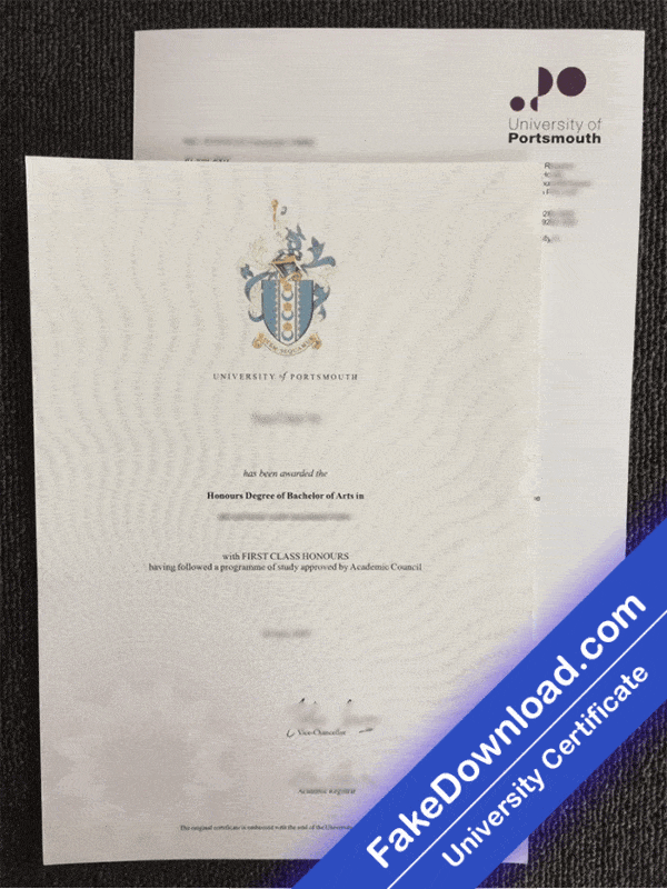 The fake Portsmouth university certificate is 100% similar to the original and is presented in full HD quality.