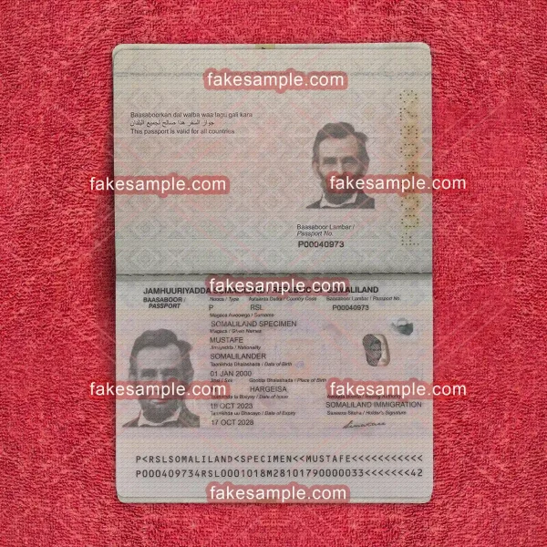 At Fakesample, we recognize the burgeoning demand for realistic and customizable document templates. One of our standout offerings is the Republic of Somaliland Passport Fake Template. Crafted with meticulous attention to detail by our experienced graphic team, our templates replicate the official document's features with striking accuracy and realism. This ensures that our clients receive only the highest quality templates for their specific needs.