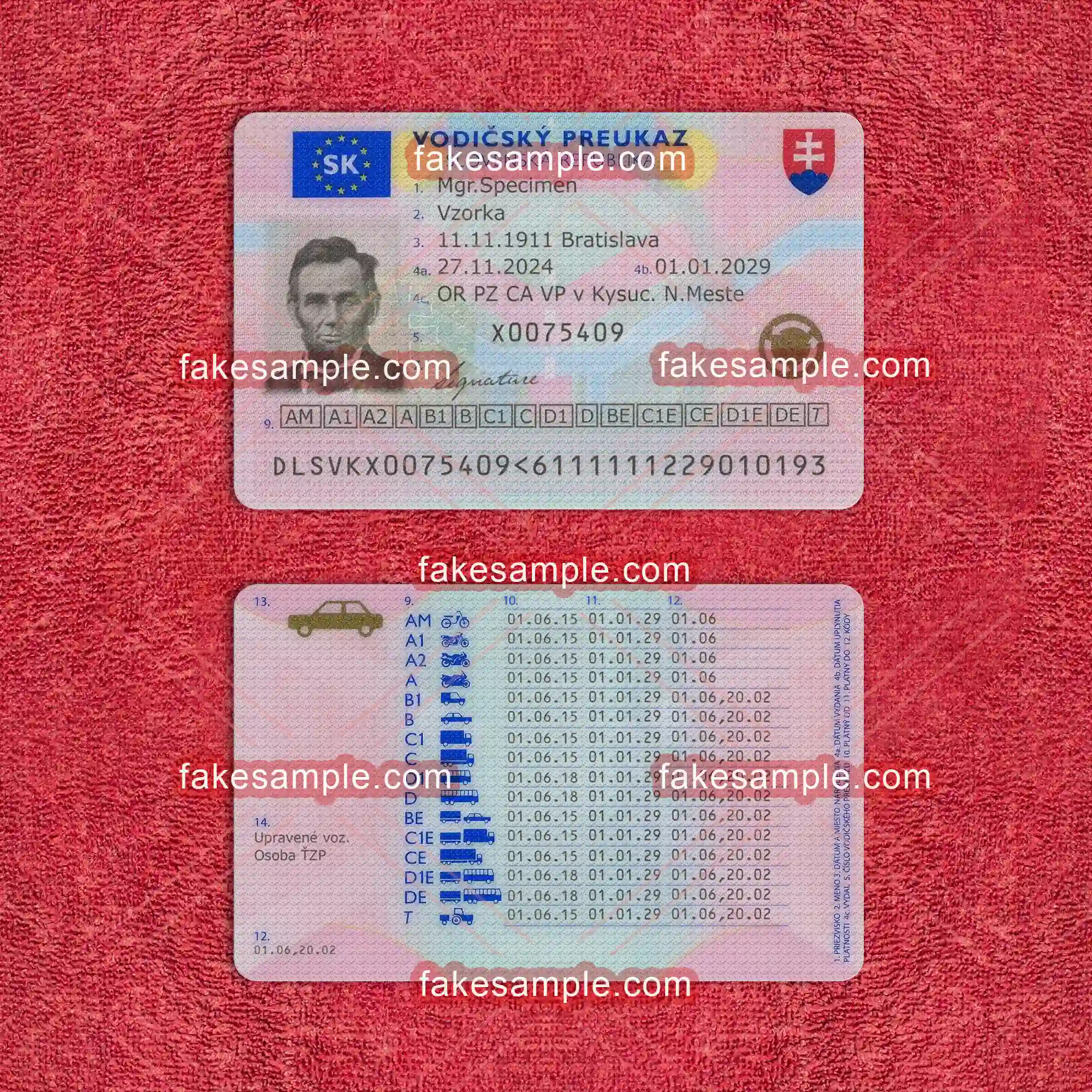 To accompany the digital expertise, Fakesample offers the making of physical Slovakia Driver's License cards. Adhering to exact specifications commonly found in genuine cards, Fakesample ensures that the replicas pass a superficial authenticity test. By employing advanced printing techniques and top-grade materials, these physical cards embody both durability and credibility, closely resembling their authentic counterparts in appearance and feel.