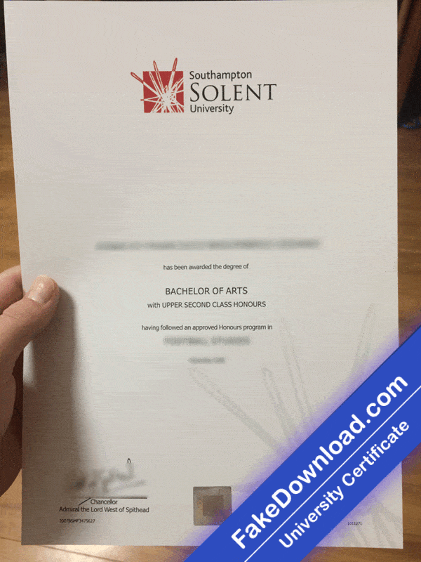 The fake Southampton Solent university certificate is 100% similar to the original and is presented in full HD quality.