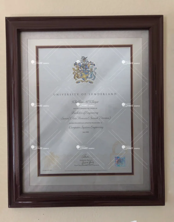 The fake Sunderland university certificate is 100% similar to the original and is presented in full HD quality.