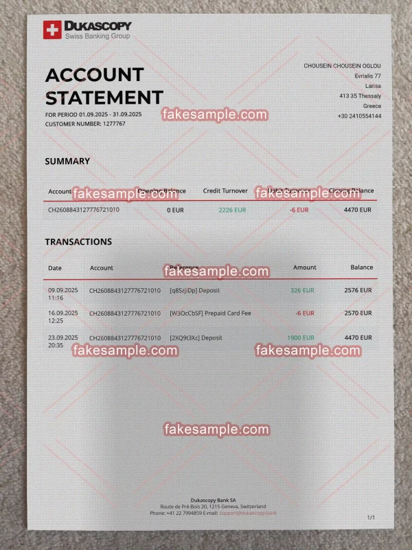 Customization is at the heart of what we do at Fakesample. Recognizing the diverse needs of our global clientele, we offer personalized design services to tailor Switzerland bank statements according to specific preferences. Our team works closely with clients to implement customizations, ranging from text adjustments to modifying the statement's aesthetic elements, ensuring your document meets your exact specifications. This bespoke service highlights our commitment to providing unparalleled flexibility and satisfaction.