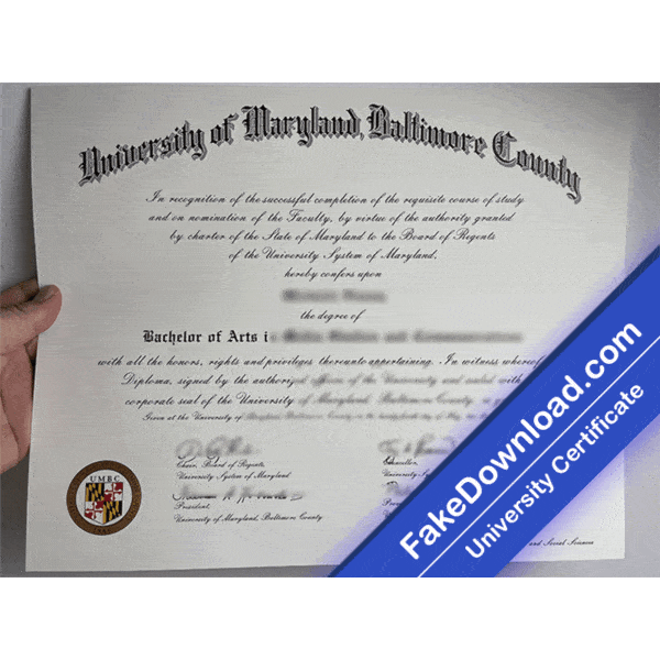 The fake Maryland, Baltimore County (UMBC) university certificate is 100% similar to the original and is presented in full HD quality.