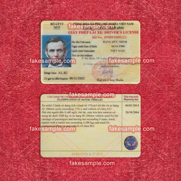 To accompany the digital expertise, Fakesample offers the making of physical Vietnam Driver's License cards. Adhering to exact specifications commonly found in genuine cards, Fakesample ensures that the replicas pass a superficial authenticity test. By employing advanced printing techniques and top-grade materials, these physical cards embody both durability and credibility, closely resembling their authentic counterparts in appearance and feel.