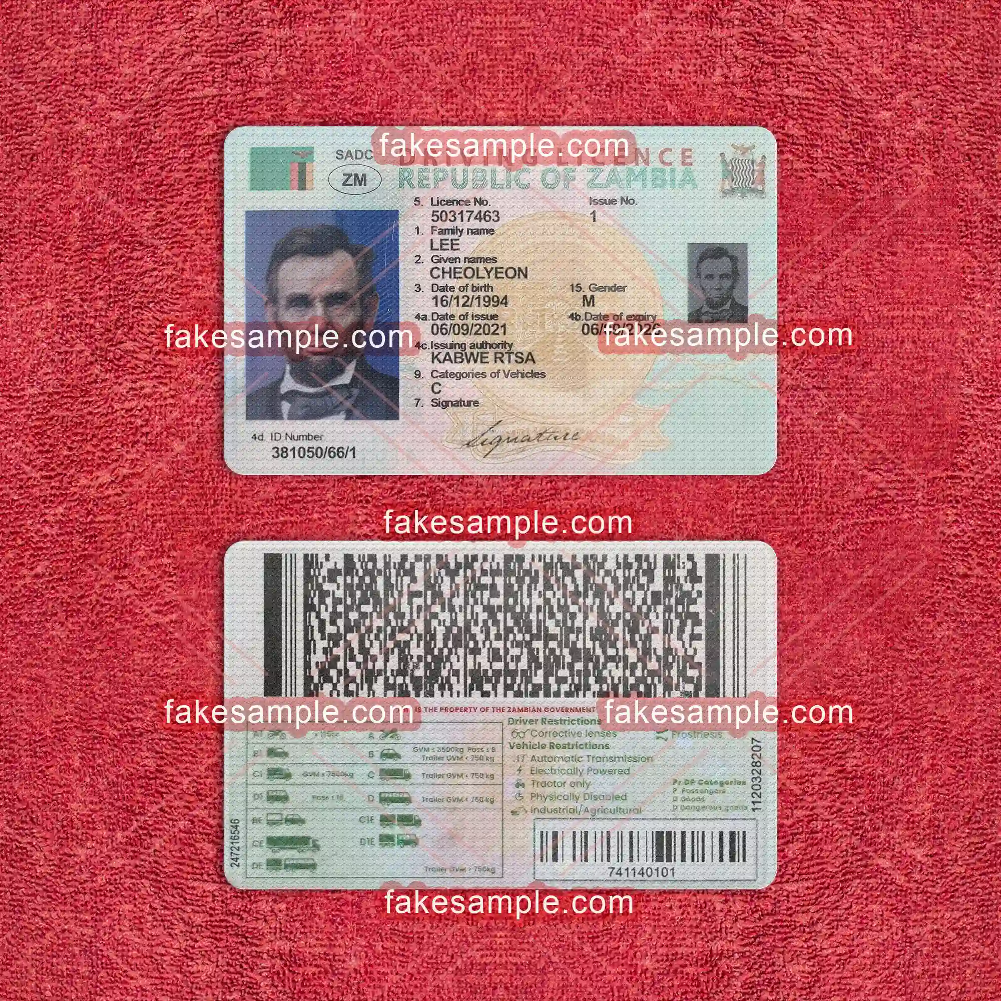 To accompany the digital expertise, Fakesample offers the making of physical Zambia (Version 1) Driver's License cards. Adhering to exact specifications commonly found in genuine cards, Fakesample ensures that the replicas pass a superficial authenticity test. By employing advanced printing techniques and top-grade materials, these physical cards embody both durability and credibility, closely resembling their authentic counterparts in appearance and feel.